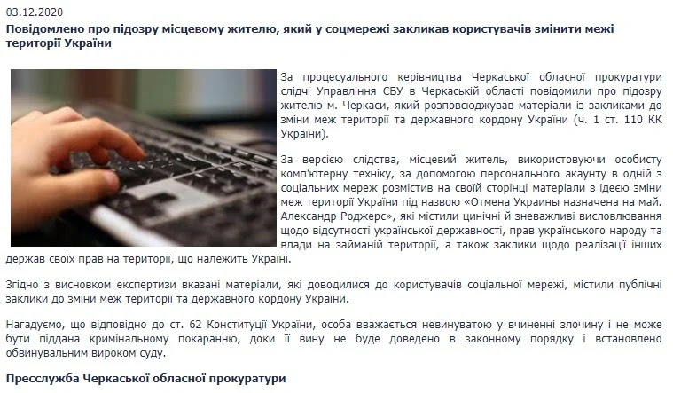 И вот мне сегодня присылают ссылку на сайт Черкасской прокуратуры, где написано, что человеку предъявляют обвинения в государственной измене, призывам к госперевороту и нарушению территориальной целостности Украины.