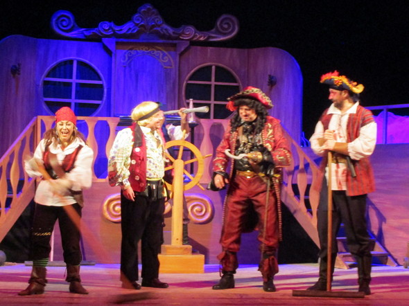Тому поряд із островом курсує піратський корабель. І знову театральні декоратори створюють нам справжню палубу із леєрами, трапами та штурвалом. На чолі команди корабля злий капітан Гак, який катує своїх бранців (іноді вразливим дітям на це страшно дивитись). А крім того, він хоче занапастити Пітера Пена та інших хлопчаків, що живуть на острові. У його підступних задумах: обов’язково полонити Венді для того, щоб вона стала мамою для всіх піратів.